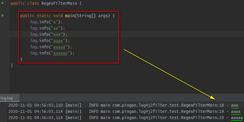 | RegexFilter | 如果日志信息匹配\${指定的正则表达式},则onMatch,否则onMismatch。注:可通过useRawMsg属性来控制这个日志信息是格式化处理后(即:最终)的日志信息,还是格式化处理前(即:代码中输入)的日志信息。 |