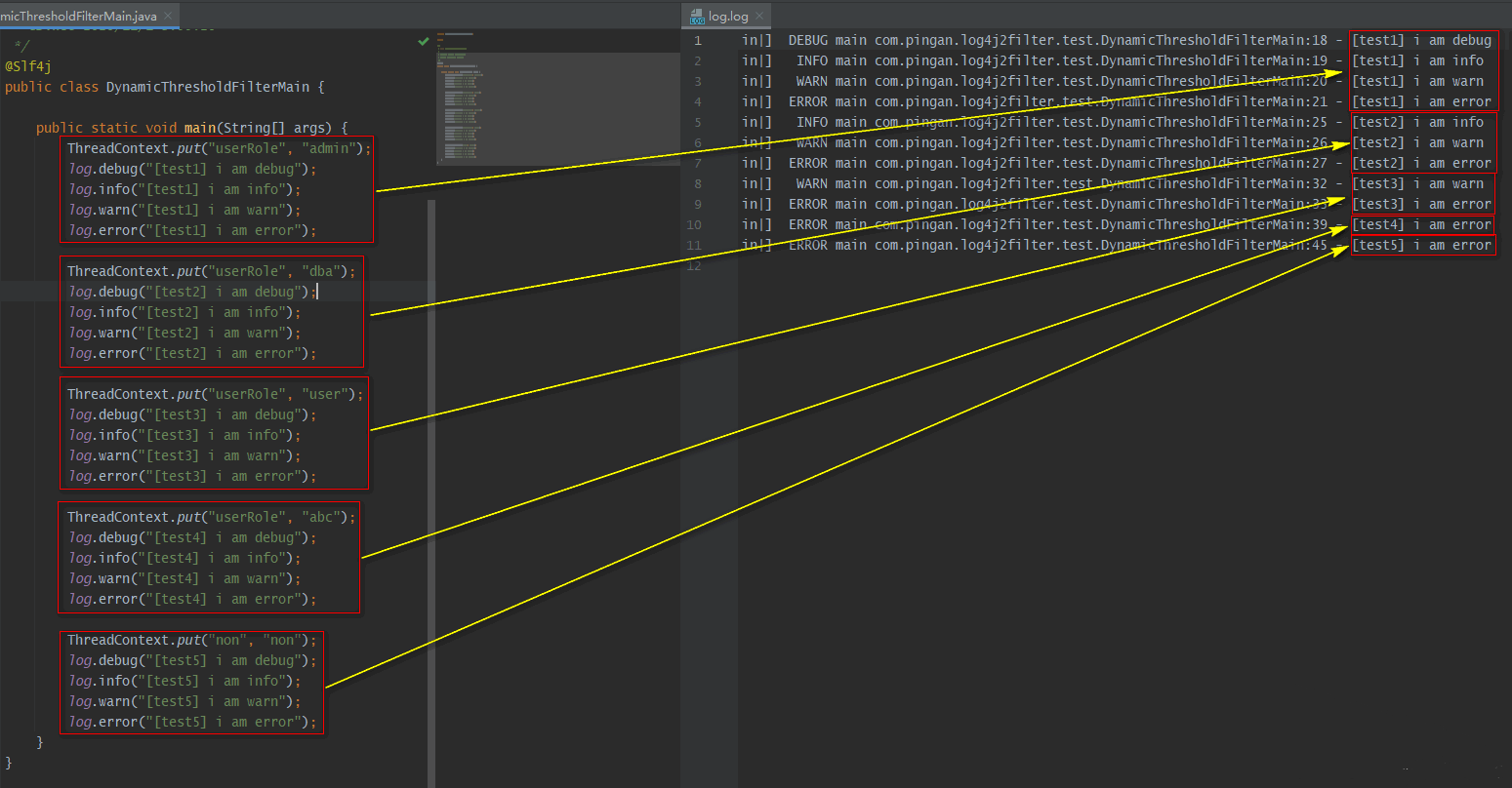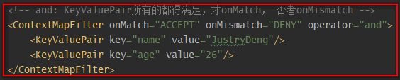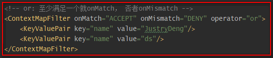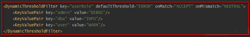 | DynamicThresholdFilter | 若上下文中包含指定的key,则触发DynamicThresholdFilter生效;若该key对应的value值等于任意一个我们指定的值,那么针对本条日志,可记录日志级别的约束下限调整为指定的级别。注:上下文默认是ThreadContext,也可以自定义使用ContextDataInjectorFactory配置ContextDataInjector来指定。 示例说明: <DynamicThresholdFilter key=""loginRole"" defaultThreshold=""ERROR"" onMatch=""ACCEPT"" onMismatch=""NEUTRAL""><KeyValuePair key=""admin"" value=""DEBUG""/><KeyValuePair key=""user"" value=""warn""/></DynamicThresholdFilter>配置,有以下情况:情况一:存在键loginRole,假设从上下文(可以理解为一个Map)中取出来的对应的值为user,那么此时,对于日志级别大于等于warn的日志,会走onMatch;其它的日志级别走onMismatch。情况二:存在键loginRole,假设从context(可以理解为一个Map)中取出来的对应的值为admin,那么此时,对于日志级别大于等于debug的日志,会走onMatch;其它的日志级别走onMismatch。情况三:【上下文(可以理解为一个Map)中,不存在键loginRole】或【存在键loginRole,但从日志上下文中取出来的值(假设)为abc, 没有对应的KeyValuePair配置】,那么此时<DynamicThresholdFilter key=""userRole"" defaultThreshold=""AAA"" onMatch=""BBB"" onMismatch=""CCC"">等价于<LevelMatchFilter level=""AAA"" onMatch=""BBB"" onMismatch=""CCC"">。 |