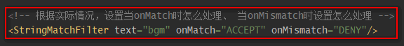 | StringMatchFilter | 如果格式化后(即:最终)的日志信息中包含\${指定的字符串},则onMatch,否则onMismatch。即:msg.contains(this.text) ? onMatch : onMismatch; |