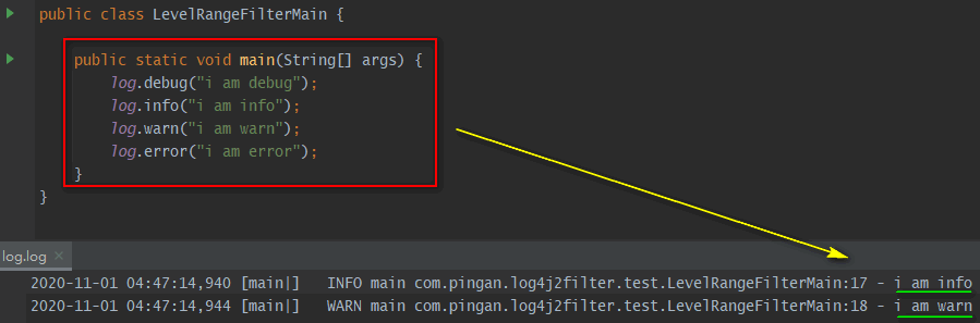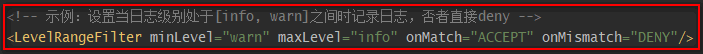 | LevelRangeFilter | 若\${maxLevel} <= 日志级别 <= \${minLevel}, 则onMatch,否则onMismatch。如: 即为只记录日志info及warn级别的日志。 |