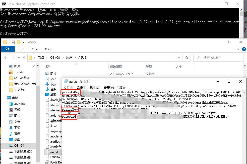 java -cp 路径/druid-版本号.jar com.alibaba.druid.filter.config.ConfigTools 密码 >> xxx.txt