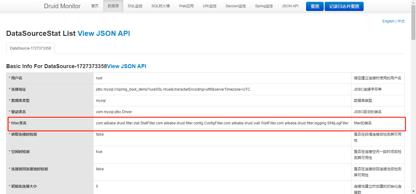 当前DataSource配置的基本信息,上述配置的Filter可以在里面找到,如果没有配置Filter(一些信息会无法统计,例如“SQL监控”,会无法获取JDBC相关的SQL执行信息)