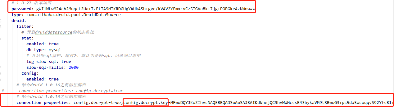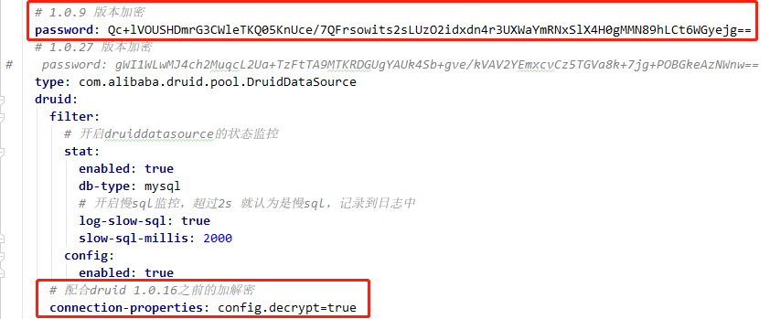 password: gWI1WLwMJ4ch2MuqcL2Ua+TzFtTA9MTKRDGUgYAUk4Sb+gve/kVAV2YEmxcvCz5TGVa8k+7jg+POBGkeAzNWnw== type: com.alibaba.druid.pool.DruidDataSource druid: filter: stat: enabled: true db-type: mysql log-slow-sql: true slow-sql-millis: 2000 config: enabled: true