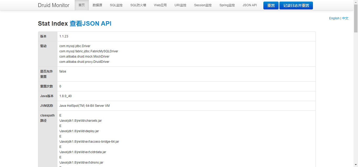 首页会展示项目使用的 JDK 版本、数据库驱动、JVM 相关统计信息。