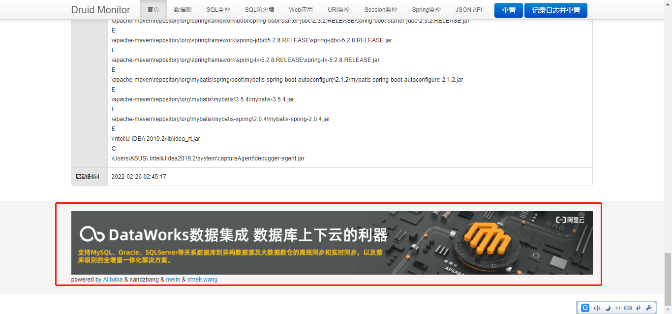原因:maven引入的druid的jar包中的common.js(里面有一段js代码是给页面的footer追加广告的)