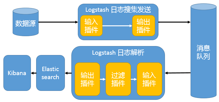 Beats 还不支持输出到消息队列,所以在消息队列两端只能是 Logstash 实例。这种架构使用 Logstash 从各个数据源搜集数据,然后经消息队列输出插件输出到消息队列中。目前 Logstash 支持 Kafka、Redis、RabbitMQ 等常见消息队列。然后 Logstash 通过消息队列输入插件从队列中获取数据,分析过滤后经输出插件发送到 Elasticsearch,最后通过 Kibana 展示。