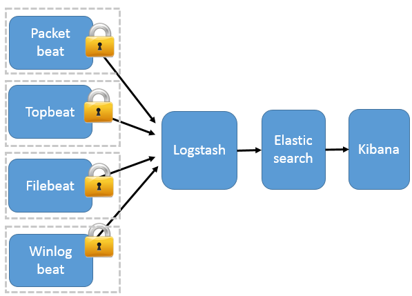 这种架构解决了 Logstash 在各服务器节点上占用系统资源高的问题。相比 Logstash,Beats 所占系统的 CPU 和内存几乎可以忽略不计。另外,Beats 和 Logstash 之间支持 SSL/TLS 加密传输,客户端和服务器双向认证,保证了通信安全。