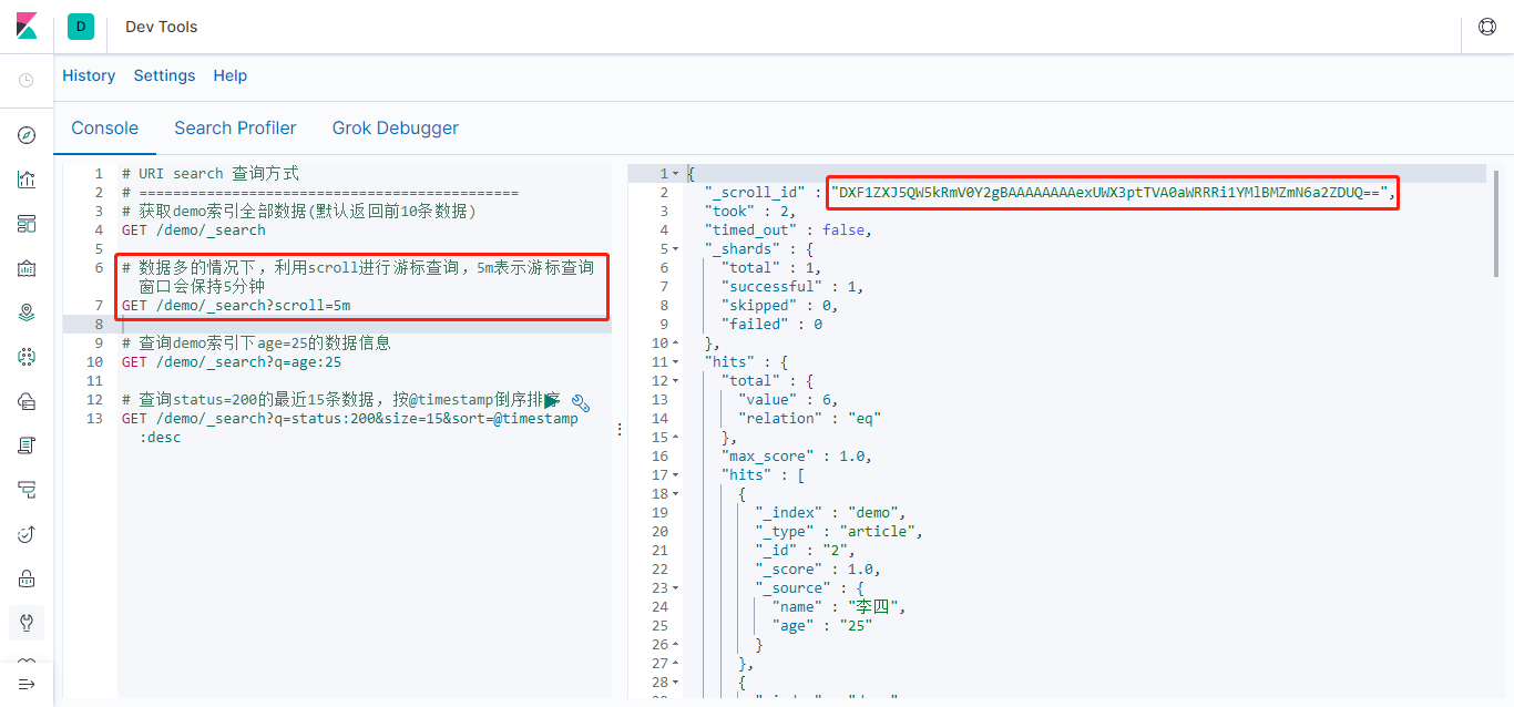 上图返回结果中有一个 _scroll_id 字段,要基于这个游标继续遍历数据只需要像下面这样,调用 /_search/scroll接口,将前面返回结果的_scroll_id作为scroll_id参数值;scroll:5m表示将当前的scroll_id查询窗口再次延长5分钟。