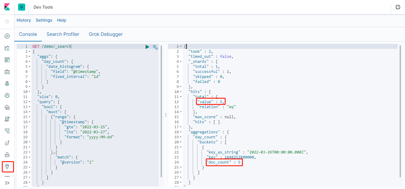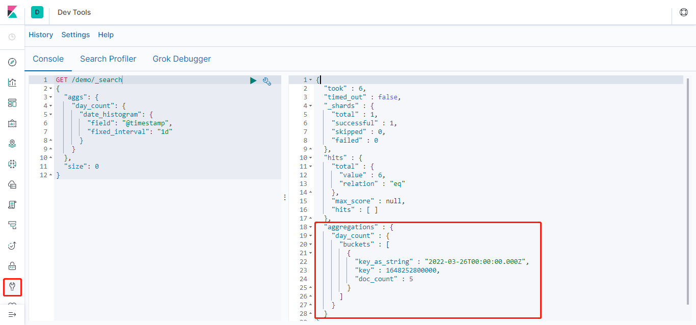 aggs:表示聚合查询;day_count:自定义的一个聚合的名称(aggs可以有多个和多层,所以需要指定一个名称);date_histogram:表示是一个日期分布器,是按照"@timestamp"这个日期字段按照1d(1天)的时间间隔进行分布的;size:0:表示不返回具体的记录,hits部分是空数组
