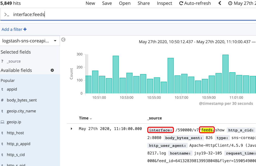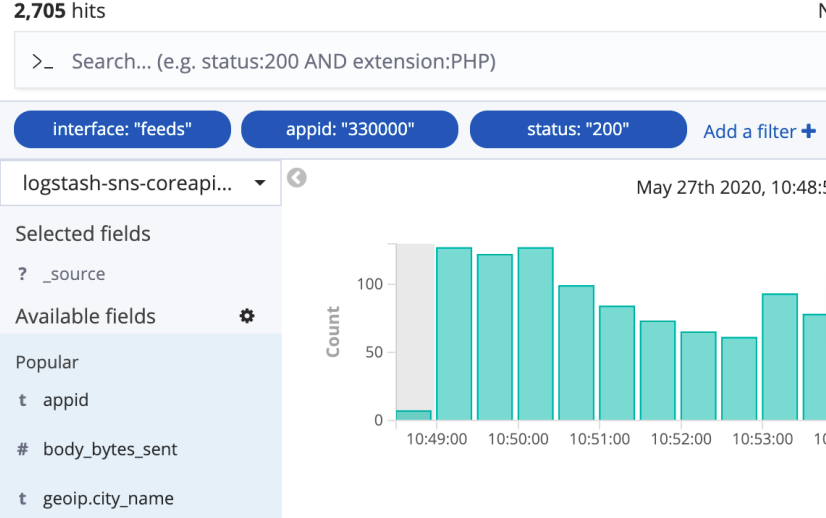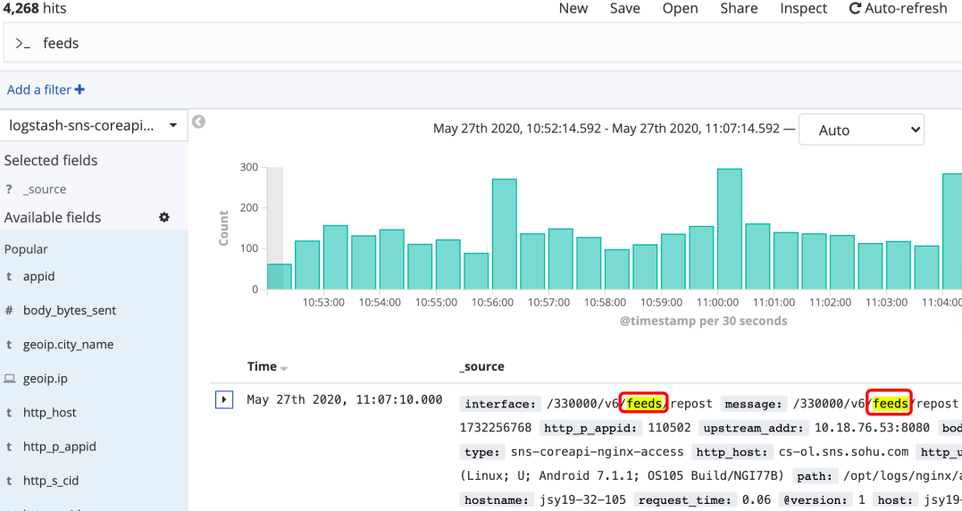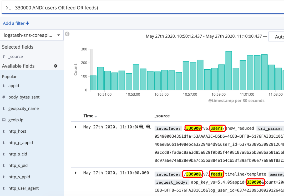 进行多个字段查询之间的关系是 and 关系,如下 查询的是“interface包含feeds关键字的并且 appid=330000 并且 status是200的 ”
