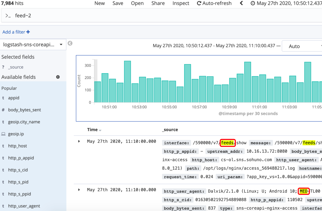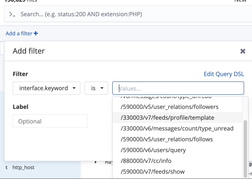 "字段名":可以进行分词查询,如下图中interface字段存储的是/330003/v7/feeds/profile/template的内容,那么每一个"/"之间的字符串都可以单独查询,因为"/"是一个默认的分词符号"字段名.keyword":使用interface整体进行查询不支持分词,使用时Kibana时也会弹出下拉列表。