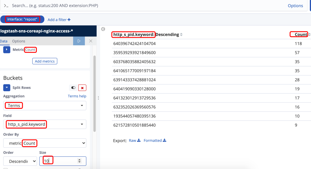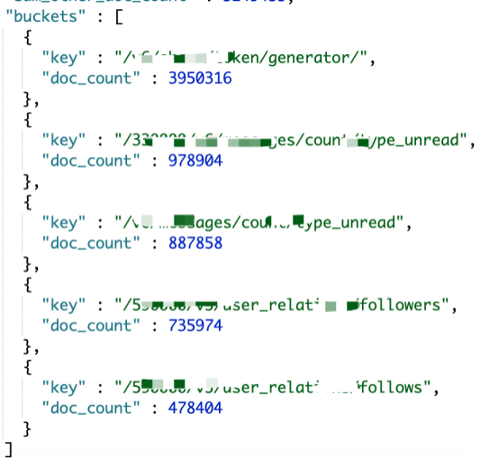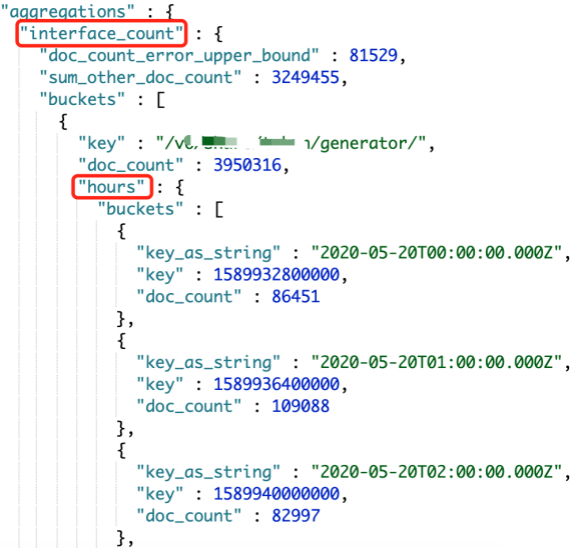 使用terms进行聚合,将aggs部分修改成如下,interface.keyword 就是接口路径(这里的interface.keyword是经过grok插件过滤后的字段),size:5 表示只展示前面5个(默认是按照doc_count倒序排序)