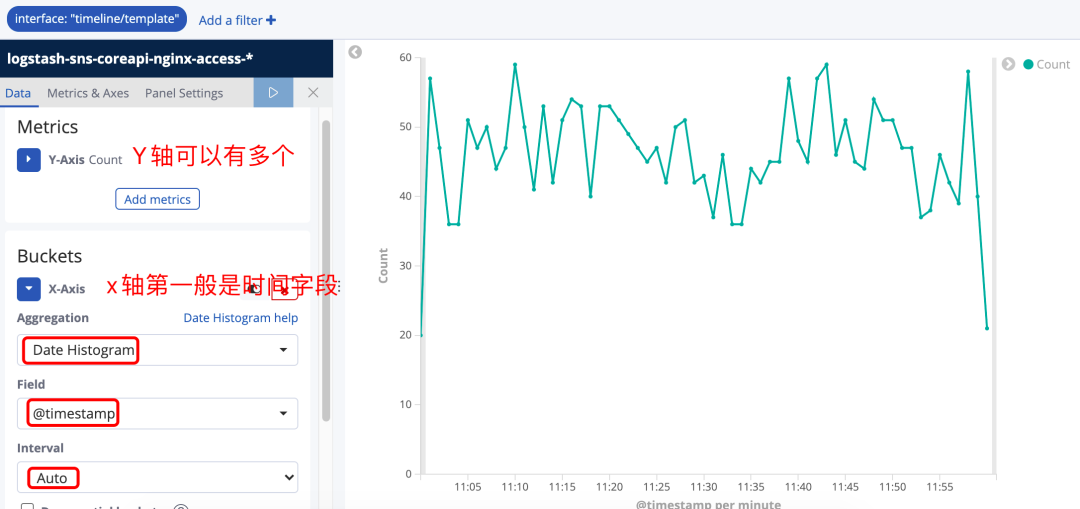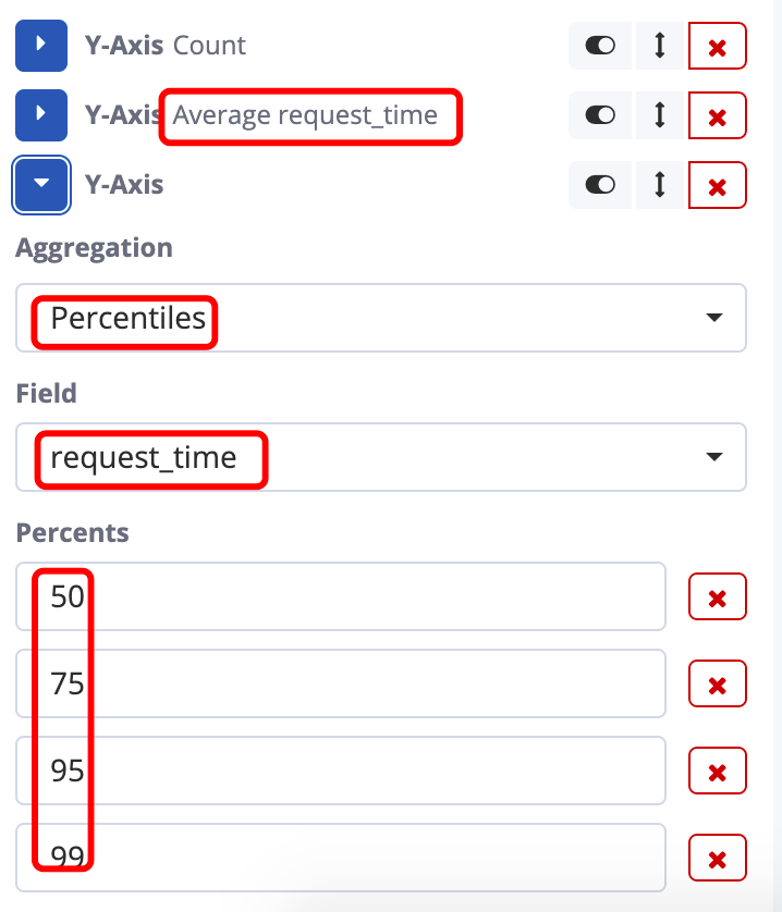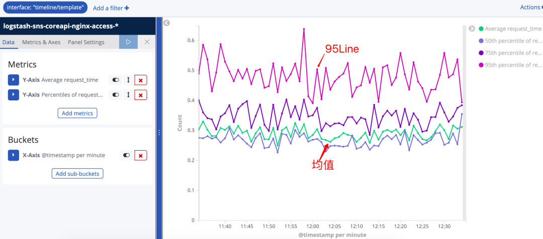 增加两个Y-Axis的metric,分别是对 request_time 求均值和对 request_time 求百分比分布