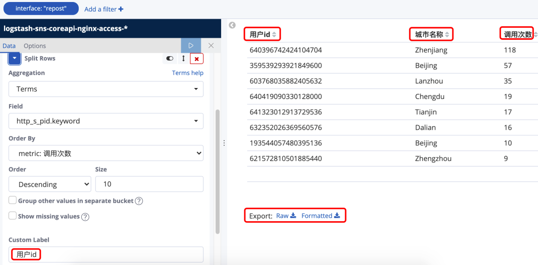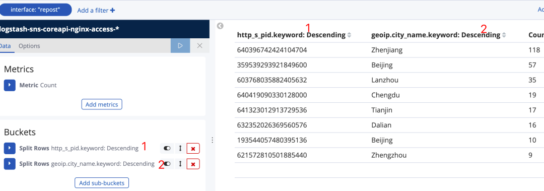 在Bucket上增加http_s_pid.keyword和geoip.city_name, 数据表 2 列是在 1 列的前提下查询出来的城市名称