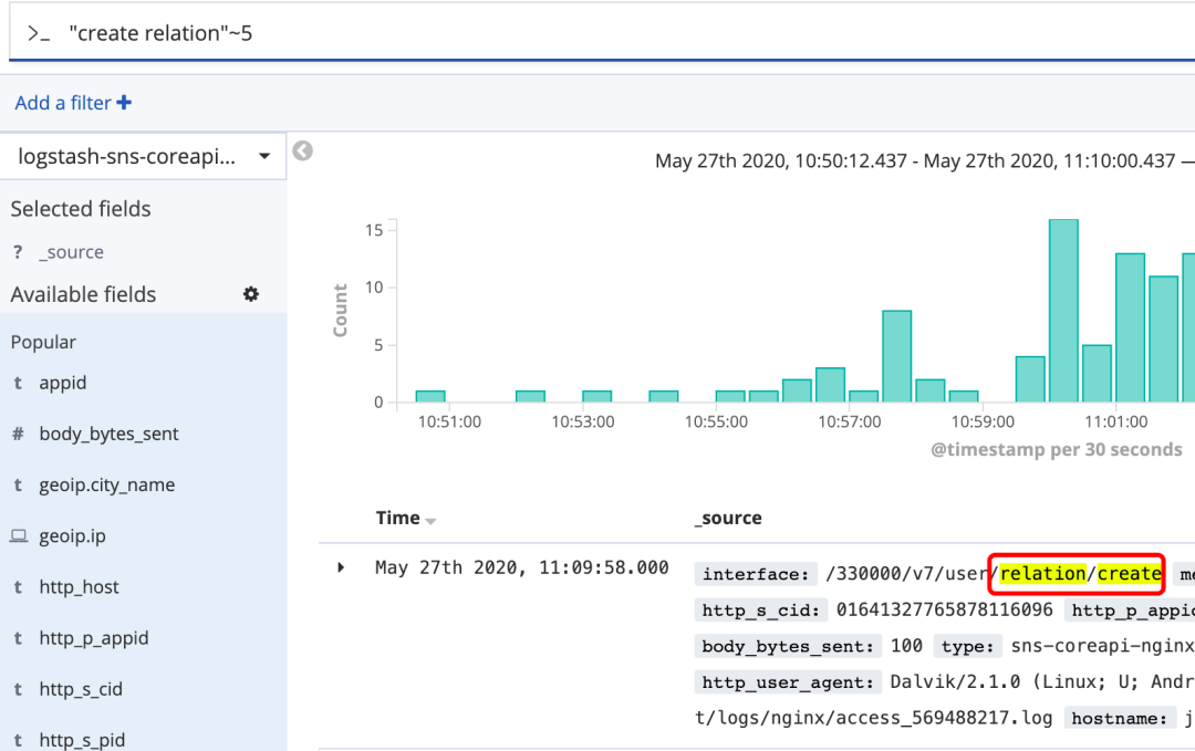 若想清楚某个接口最近1小时都有哪些用户和都来自哪些城市。这里就用到了Kibana Visualize。