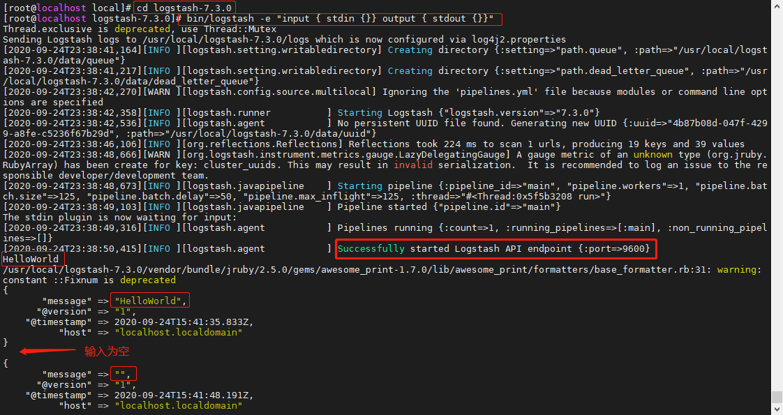 在控制台输入 HelloWorld ,看到如下效果代表 Logstash 安装成功
