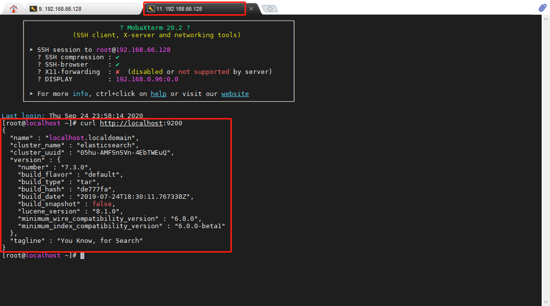 再次启动Elasticsearch,另起会话窗口执行 curl http://localhost:9200 命令,如出现如下效果,则 Elasticsearch 安装成功。