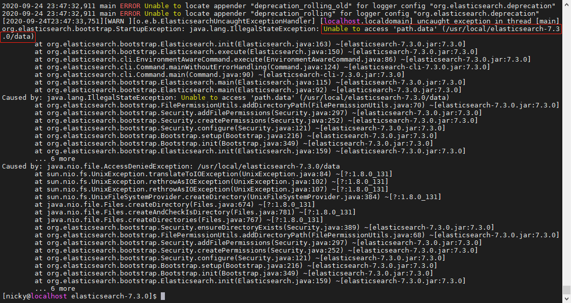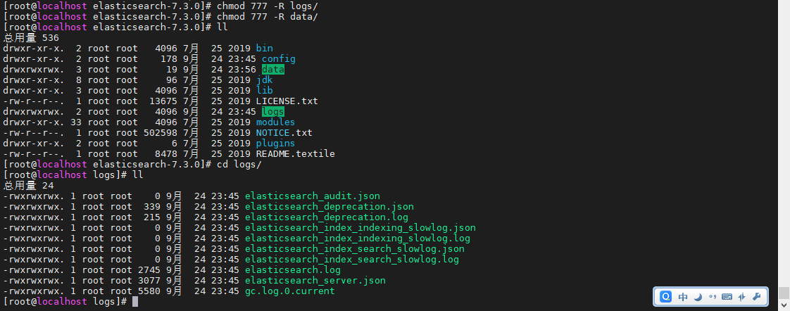 elasticsearch需在data目录和logs目录中存放与修改数据文件,因此在安装目录下创建data目录,再赋予data目录和logs目录及其子文件的读写权限
