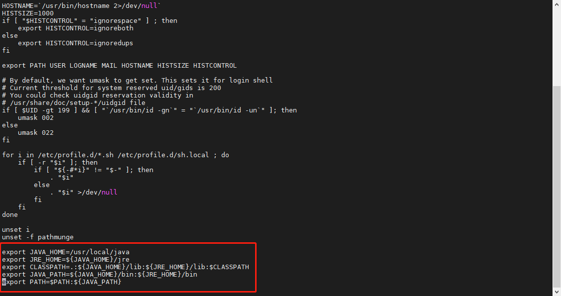 通过命令编辑profile文件,在文件末尾(按大写"G"移至文件末尾)添加以下内容(按"i"进入编辑):