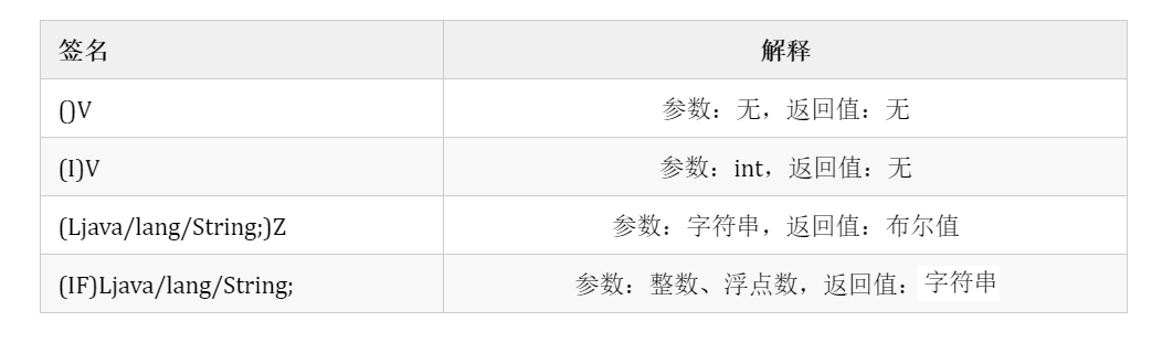 关于 Java 方法签名的具体定义,可以参考:JNI Type Signatures。